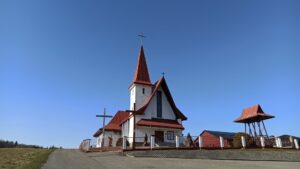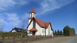Podążamy za drogą główną. Kościół będziemy mieć po prawej stronie, na lekkim wzniesieniu.