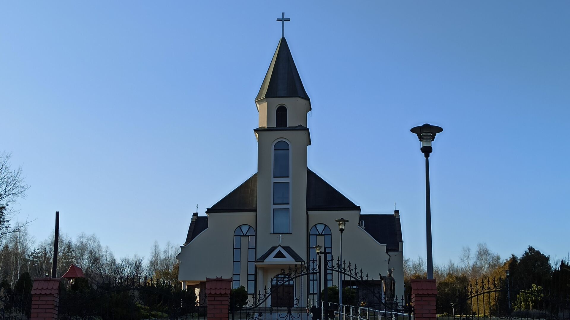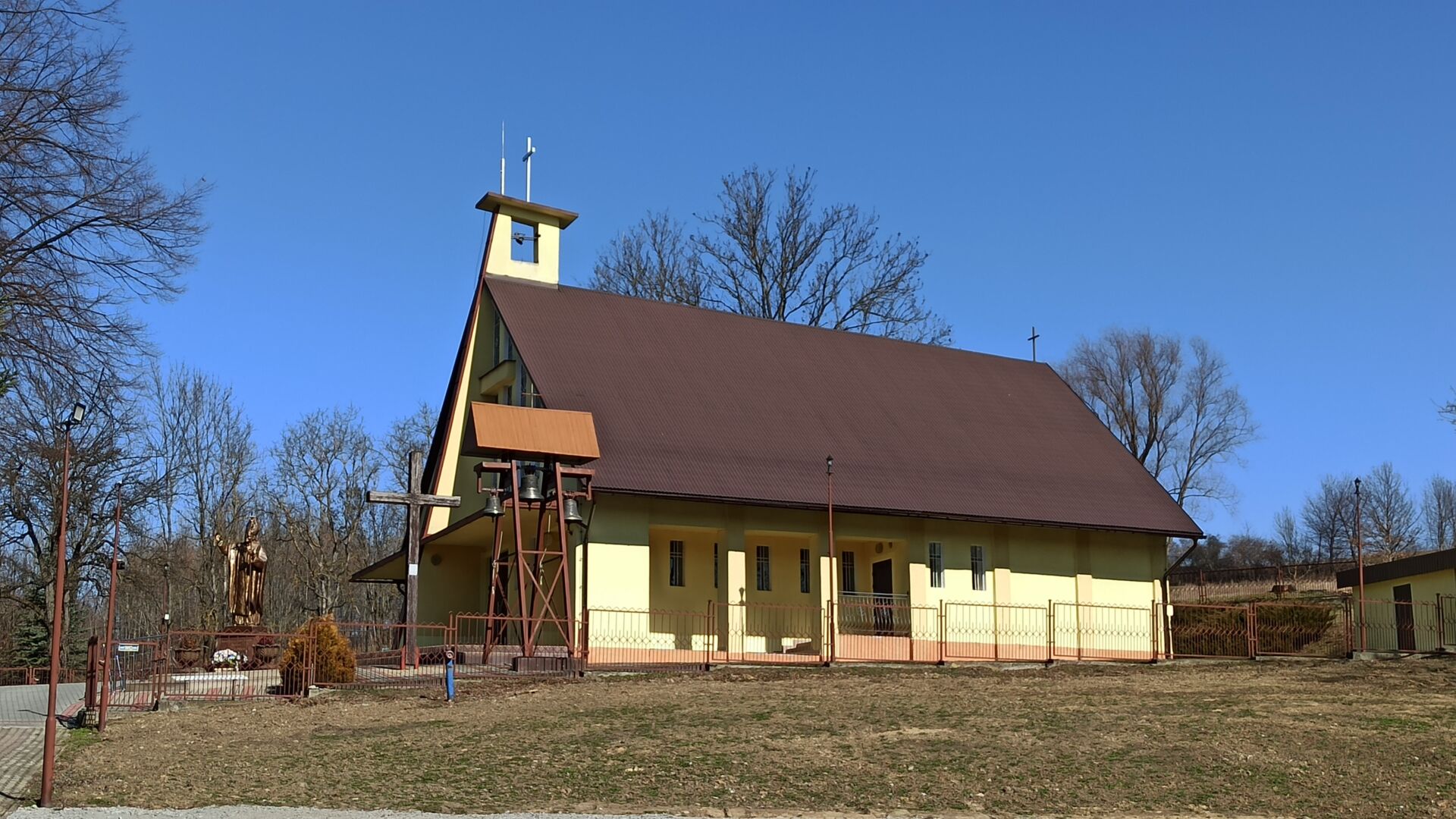 Schodzimy główną bramą od kościoła i skręcamy w prawo. Kierujemy się główną drogą aż do wzniesienia, na którym skręcamy w lewo bezpośrednio pod krzyż i pomnik św. Jana Pawła II.